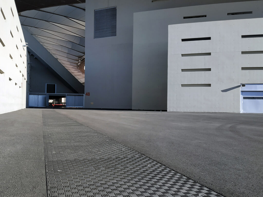 A solução tinha de ser fiável, sem manutenção e a longo prazo. Também teve de ter em conta a segurança dos peões que passam por cima das tampas e simplificar a sua remoção regular. Além disso, as dimensões únicas da vala exigiram um sistema personalizado de tampas de caleira modulares, com diferentes capacidades de cargas nominais em diferentes áreas: Classificação de carga nominal A15 para zonas pedonais, C250 para a entrada de fornecedores.