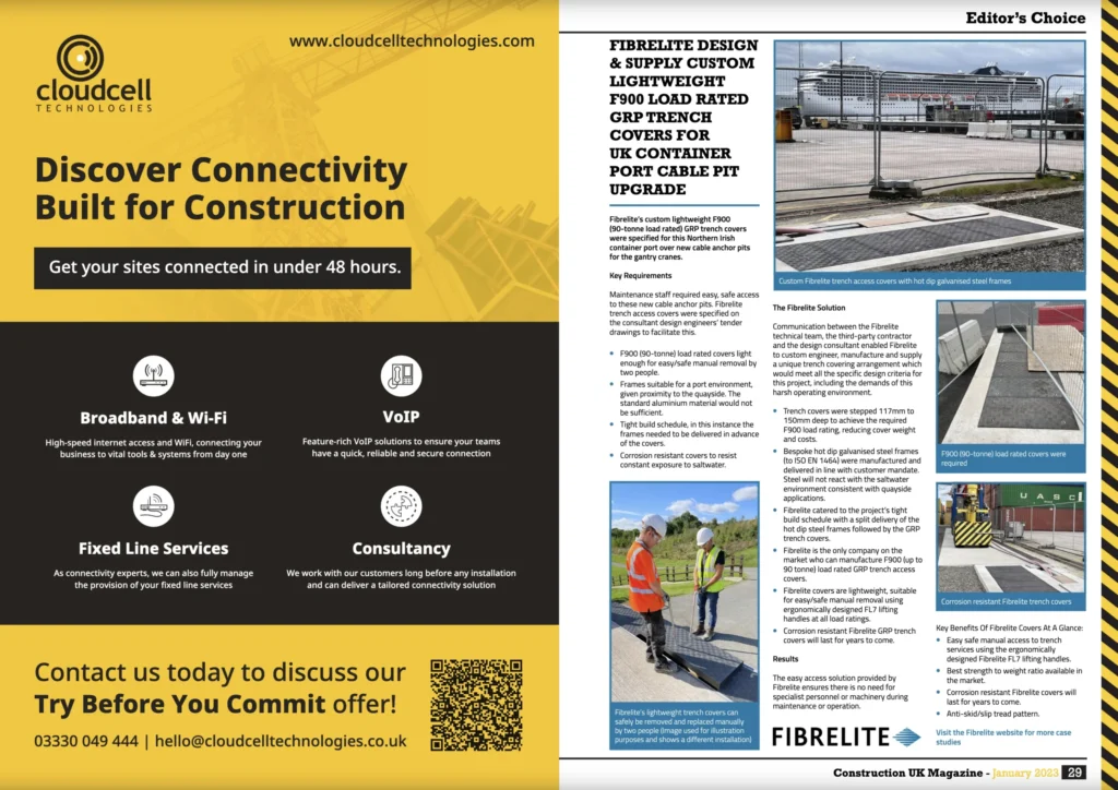 Ao contrário das tampas metálicas e de betão armado, a tampas Fibrelite são fabricadas a partir de um material composto de PRFV que é inerte e impermeável à corrosão da água e do sal, bem como a muitos outros compostos corrosivos.