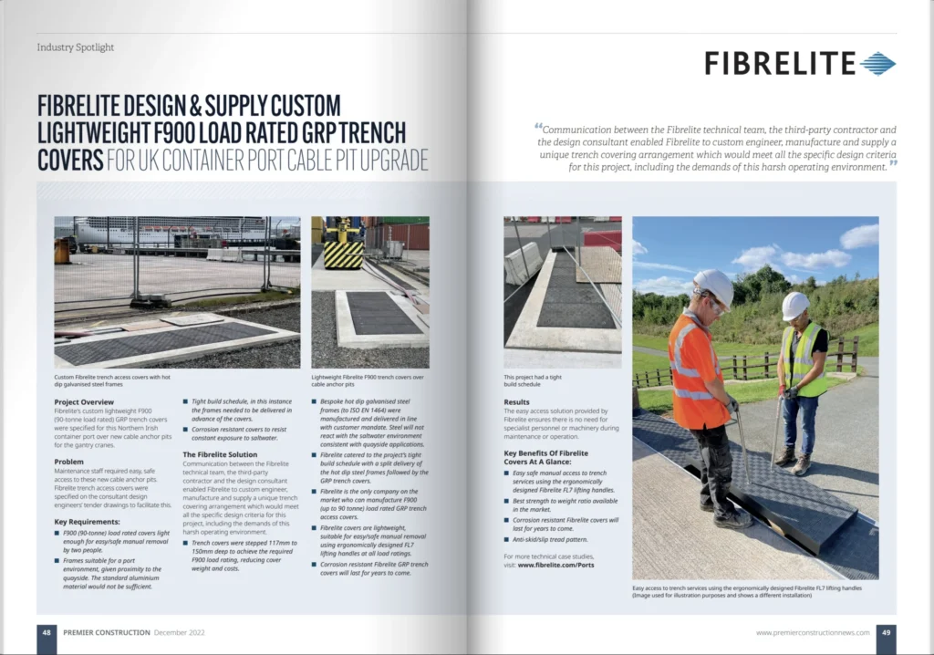 Perfeitas para caleiras técnicas de cablagens elétricas de navio para terra, caleiras técnicas para a cablagem do cais, poços de iluminação fora da pista e muitas outras aplicações portuárias e aeroportuárias altamente exigentes, a tampas Fibrelite permitem uma instalação sem problemas com um mínimo de tempo de inatividade no local, com opções de readaptação disponíveis para encaixar diretamente em abatimentos/quadros existentes, evitando partir o betão. Também estão disponíveis cores personalizadas, marcas, sistemas de fixação, portas de inspeção e portas de saída de cabos.